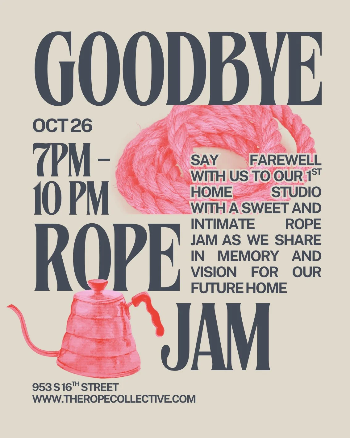 Say Farewell with us to our 1st home studio with a sweet and intimate rope jam as we share in memory and vision for our future home. If you know the history of The Rope Collective… we began as a little monthly invite only rope jam in the living room / backyard of founder Toni Brianna Guida Wendel… once we got too big, we started hosting them at artist and creator Gabriella’s home… we soon realized there was a hunger to LEARN rope in San Diego and a lack of a zen, comfortable, and welcoming space to learn. This is when we were offered the back room of a vintage store in Chula Vista ( shout out Upright Citizen!) and The Rope Collective was born! Since then we have seen so many iterations: virtual all through COVID, bouncing from venue to venue, and in 2022 we opened our first brick and mortar: The Barrio Logan studio!